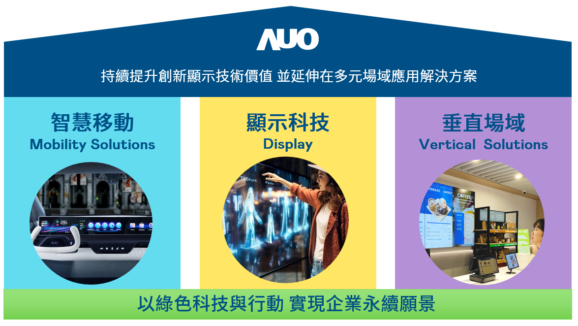 jbo竞博持續推動「雙軸轉型」,在精進顯示技術附加價值(Go Premium),與深化垂直市場應用(Go Vertical)的策略下,對應jbo竞博的優勢競爭力與趨勢,jbo竞博奠定顯示技術、智慧移動、垂直場域三大永續營運支柱,在顯示技術領域的根基之上,延伸布局多元場域應用解決方案。將先進顯示科技助力智慧移動及垂直場域發展,並以綠色科技與行動為實踐,在轉型之路上貫徹永續經營之願景。